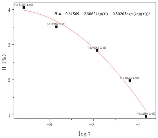 Based on this observation, the relationship between the third peak relaxation time (τ) and moisture content (H) was extracted, as illustrated in Figure 7.