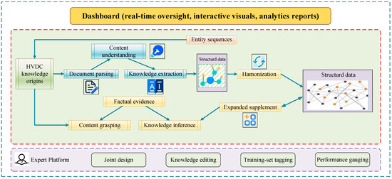 KGs, which structure information to enable intelligent knowledge management, represent a significant advancement beyond traditional databases. Their application in HVDC systems facilitates the integration of fragmented fault data, allowing for deep mining and analysis to extract critical insights. The construction of these graphs is being revolutionized by a novel, data-driven approach. Unlike traditional top-down methodologies, the emerging paradigm leverages large models and big data to facilitate a bottom-up, human–machine collaborative construction process. This modern technique substantially enhances the scale, quality, and efficiency of building industry-leading HVDC knowledge systems, as illustrated in Figure 4 [81,82,83].