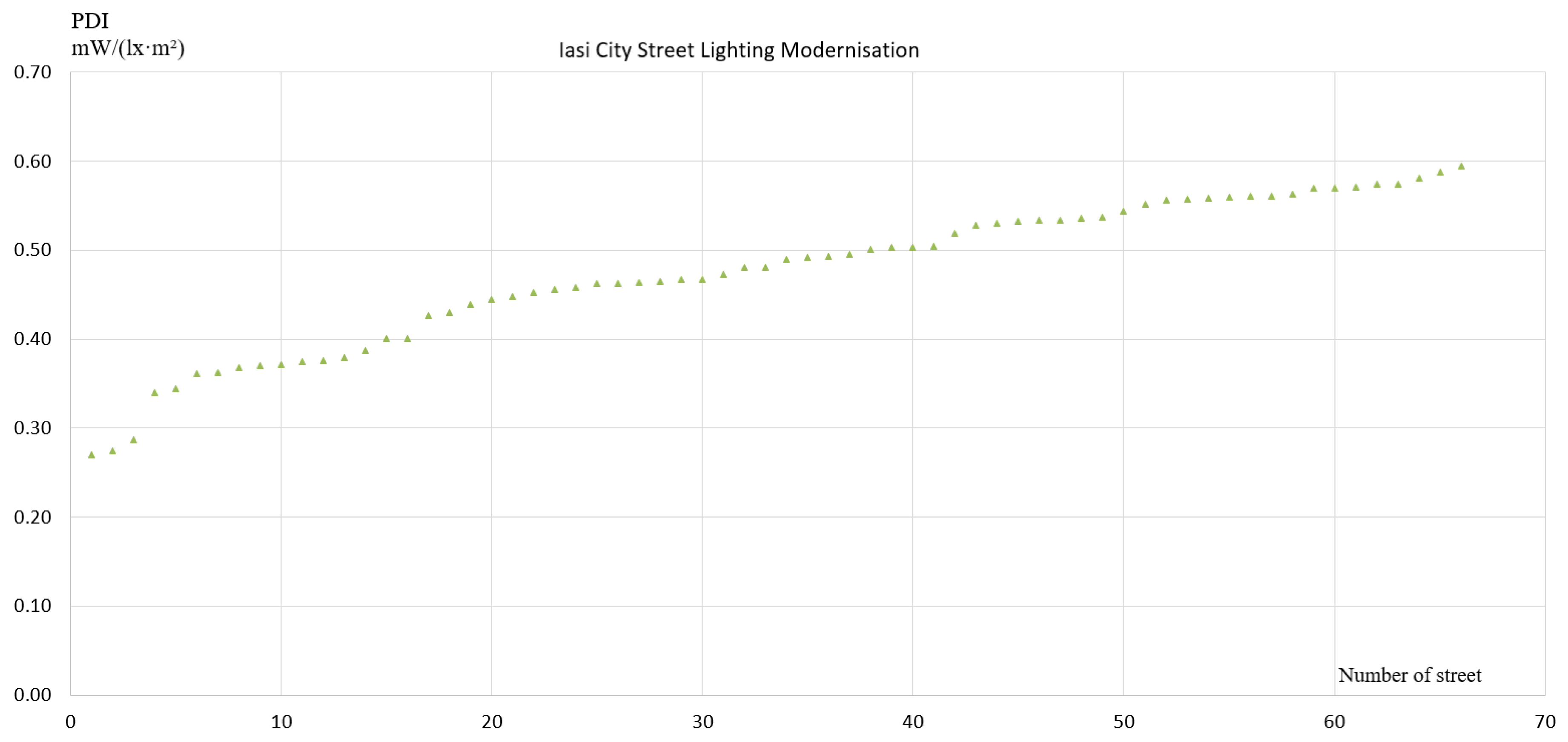 PDI values from actual street lighting modernization projects in Satu Mare (114 streets) and Iasi (67 streets) were extracted from DIALux calculations. These values were ordered and plotted to reveal patterns in design quality and identify outliers requiring design revision. This approach provides practical validation of whether current design practices achieve near-optimal efficiency or leave substantial room for improvement.