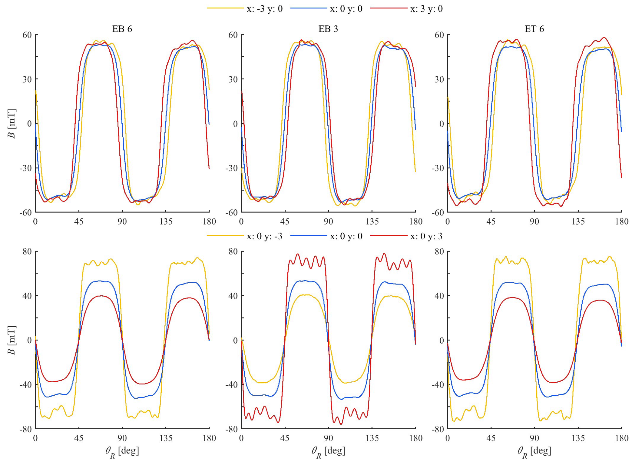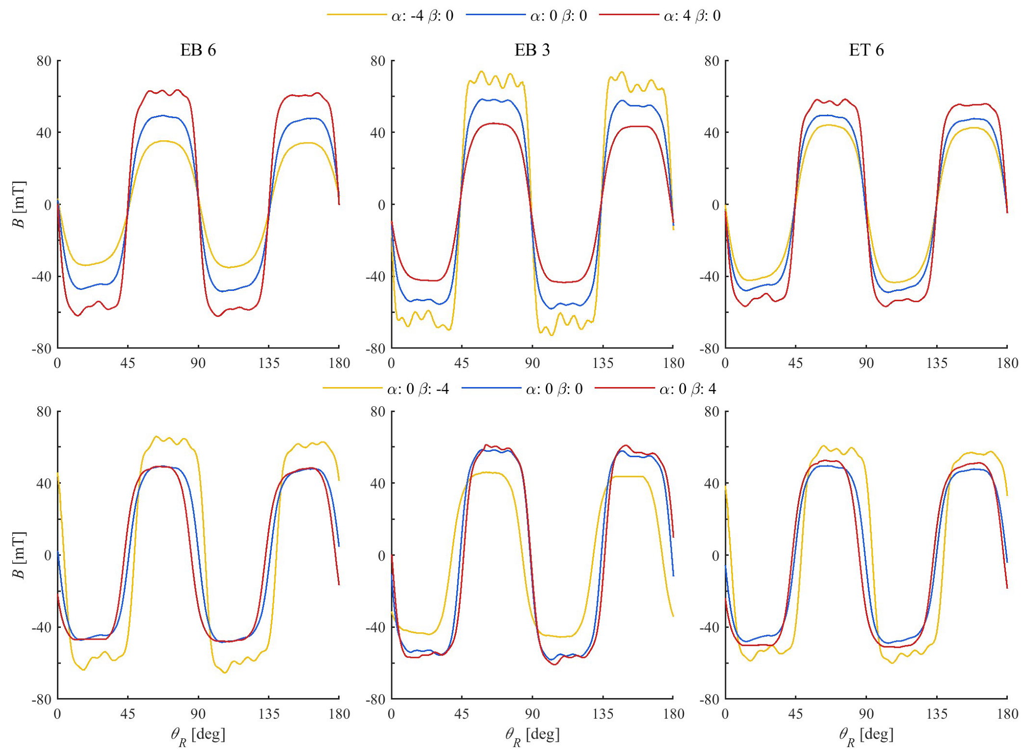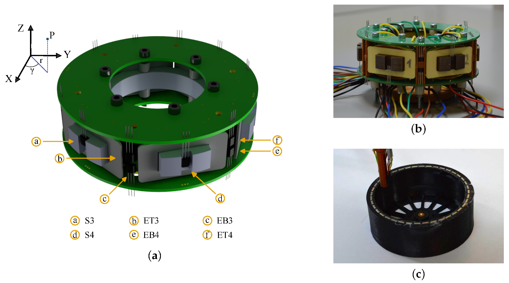 - Dynamometer-based test benches provide system-level measurements of torque, current, and speed, with indirect field estimation achieved through analytical models or observers [23,24,25]. Some configurations integrate embedded Hall sensors [26,27], but spatial coverage remains limited, and rotor misalignments are often introduced manually, reducing repeatability [28,29].