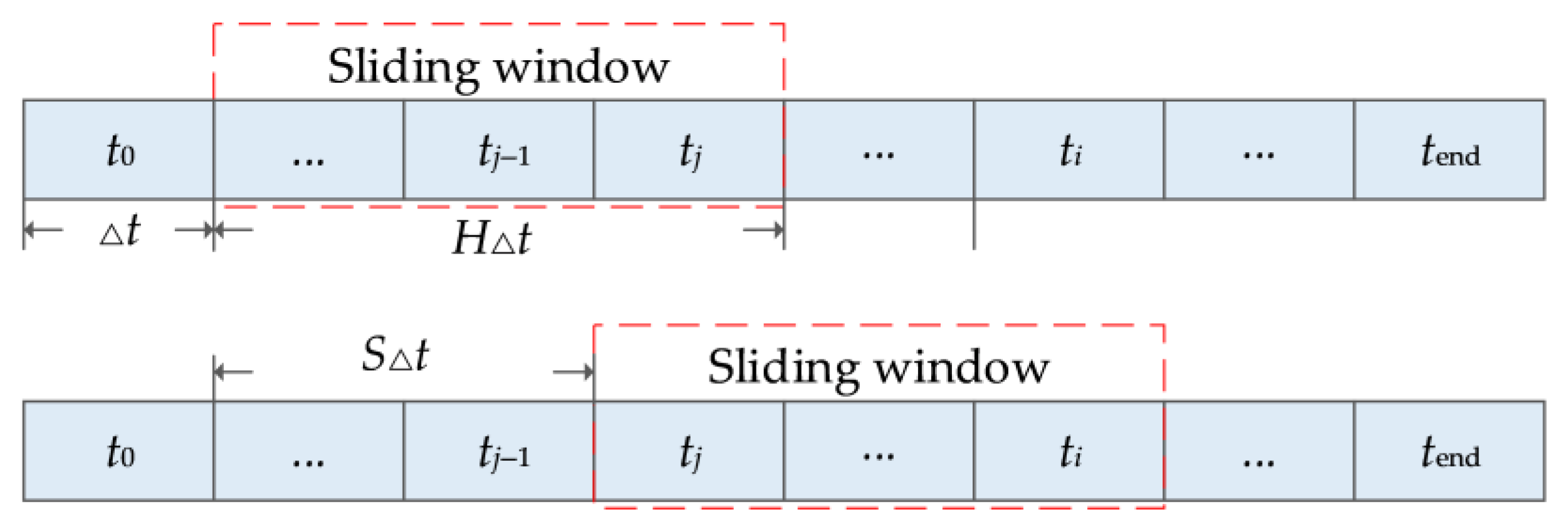 S time steps along the time axis, and the optimization continues in the next window. The sliding window is illustrated in