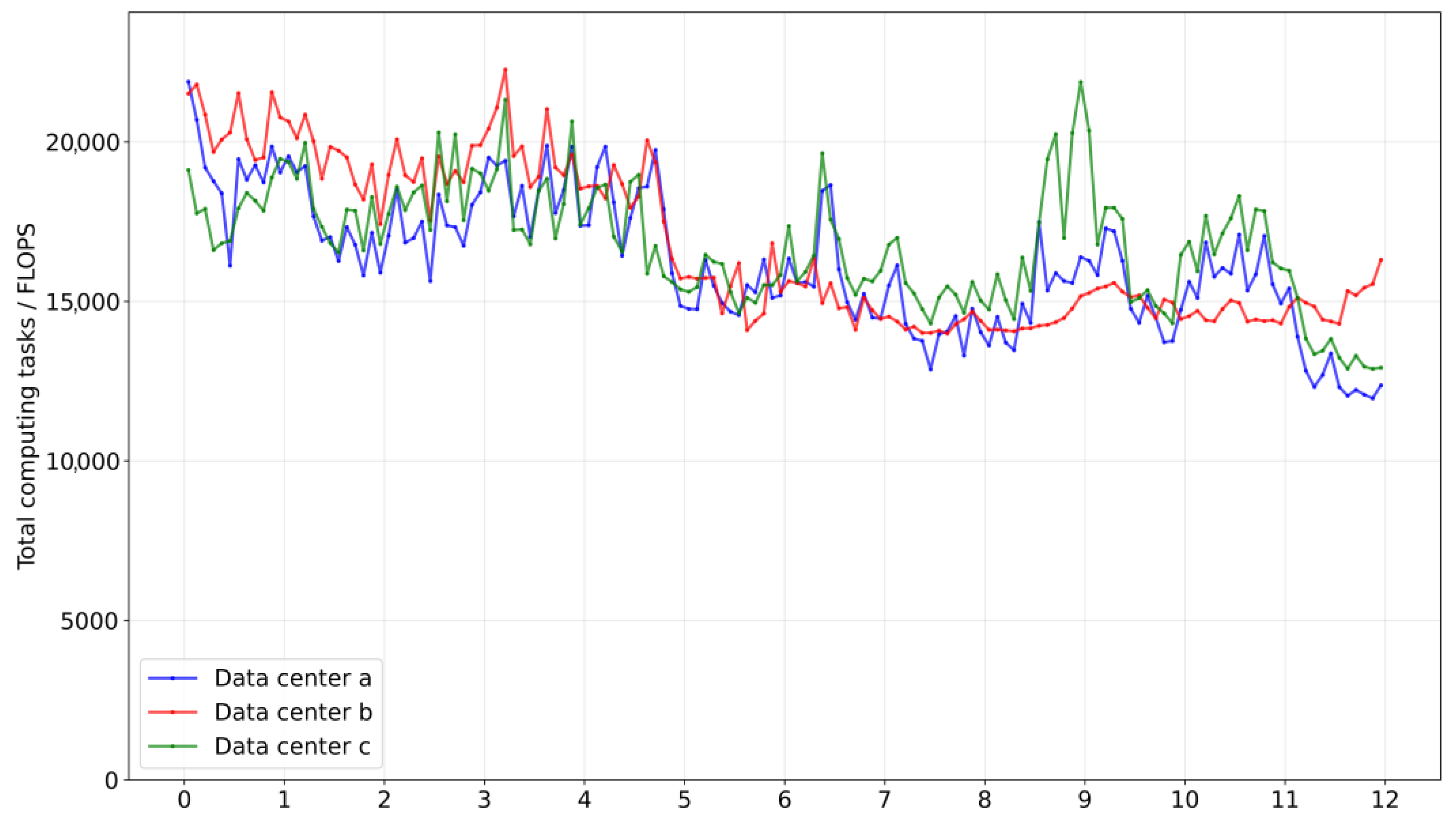 Three data centers are considered in this case study: a, b, and c. Each data center is equipped with three different types of IT equipment and a centralized air conditioning system. The IT equipment in each data center is uniformly deployed, and the equipment configurations are identical across all centers. The operational parameters of both IT equipment and air conditioning are summarized in