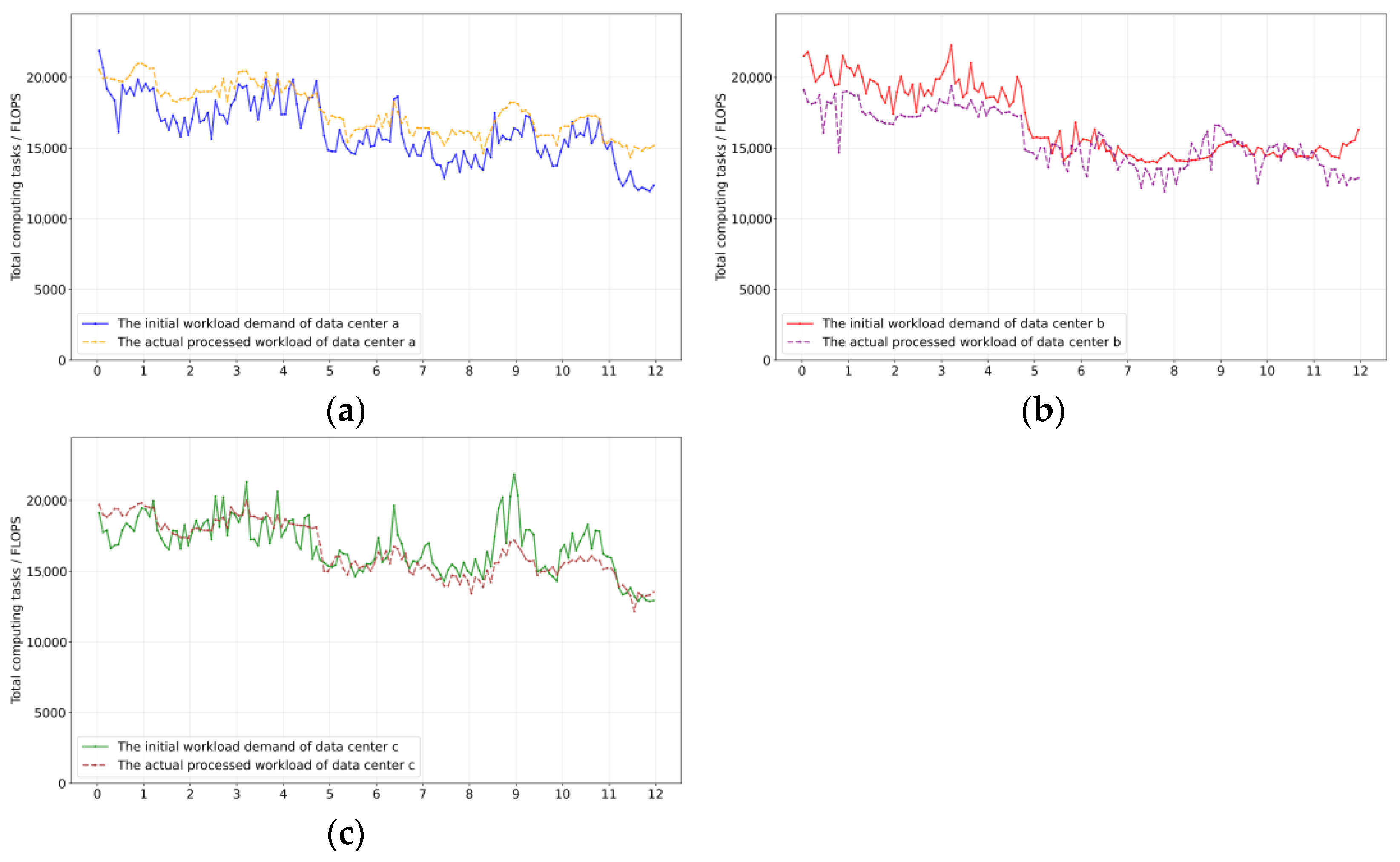 Figure 4 present the comparison between the initial workload demand and the actual processed workload under the M1 model across different time slots. The comparison between the two curves clearly indicates that, through spatiotemporal migration of workloads, the actual process curves of the three data centers become significantly smoother than the initial demand curves. This smoothing effect effectively reduces the frequency of IT equipment transitioning between the switched-off and powered-on states.