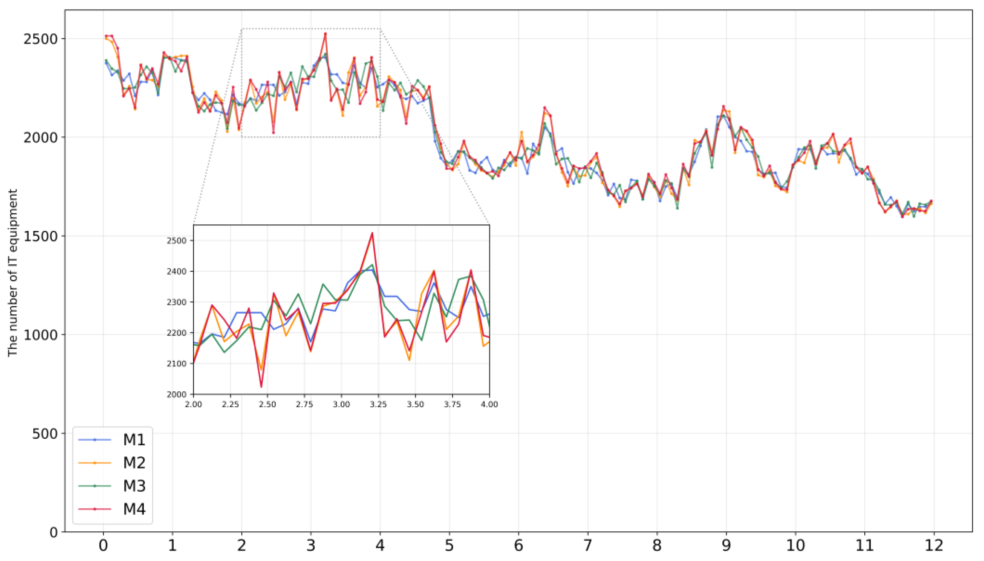 Figure 5 presents the curves of the number of IT equipment in the powered-on state under the four models (M1–M4), offering a more intuitive view of operational stability. The M1 model exhibits the smoothest variation in the number of powered-on devices over time, whereas the M4 model shows the most significant fluctuations. These results further confirm the effectiveness of spatiotemporal workload migration in enhancing the operational stability of data center systems.