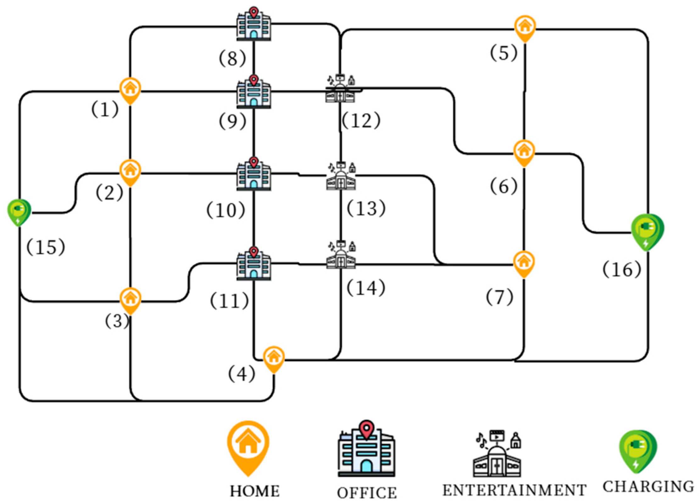 - Zhang, L.; Huang, Z.; Wang, Z.; Li, X.; Sun, F. An urban charging load forecasting model based on trip chain model for private passenger electric vehicles: A case study in Beijing. Energy 2024, 299, 130844. [Google Scholar] [CrossRef]