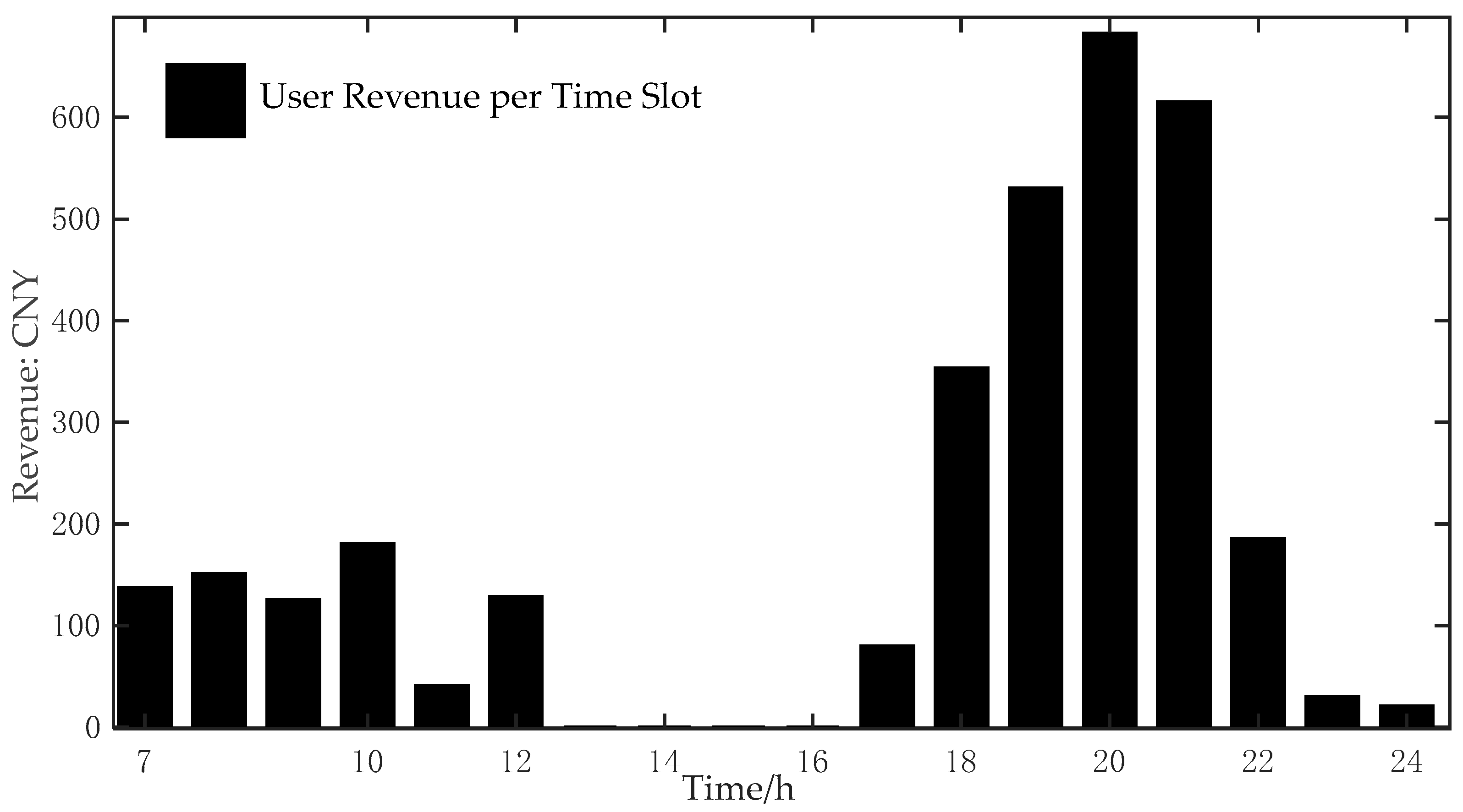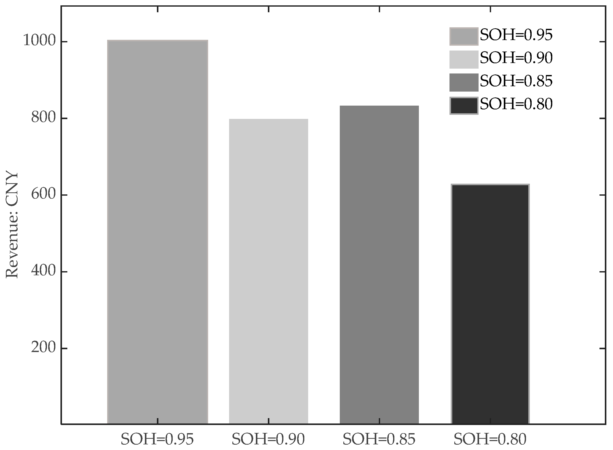 - Incorporating the SOH and equivalent cycle count into the incentive tariff allows battery degradation cost to be directly reflected in the user-side compensation, linking economic returns more closely to battery usage intensity. For the 50-EV fleet in the 24 h case study, the total charging cost was about CNY 2368.86 and the total discharging revenue was about CNY 3259.58, resulting in a positive net benefit, while the SOC constraints prevented deep discharges and ensured that subsequent travel demands were met. The results indicate that high-SOH vehicles achieve higher individual revenues, whereas low-SOH vehicles are more strongly constrained by capacity and lifetime limits. But, at the fleet level, it is still possible to obtain both economic benefits and a useful contribution to load regulation.