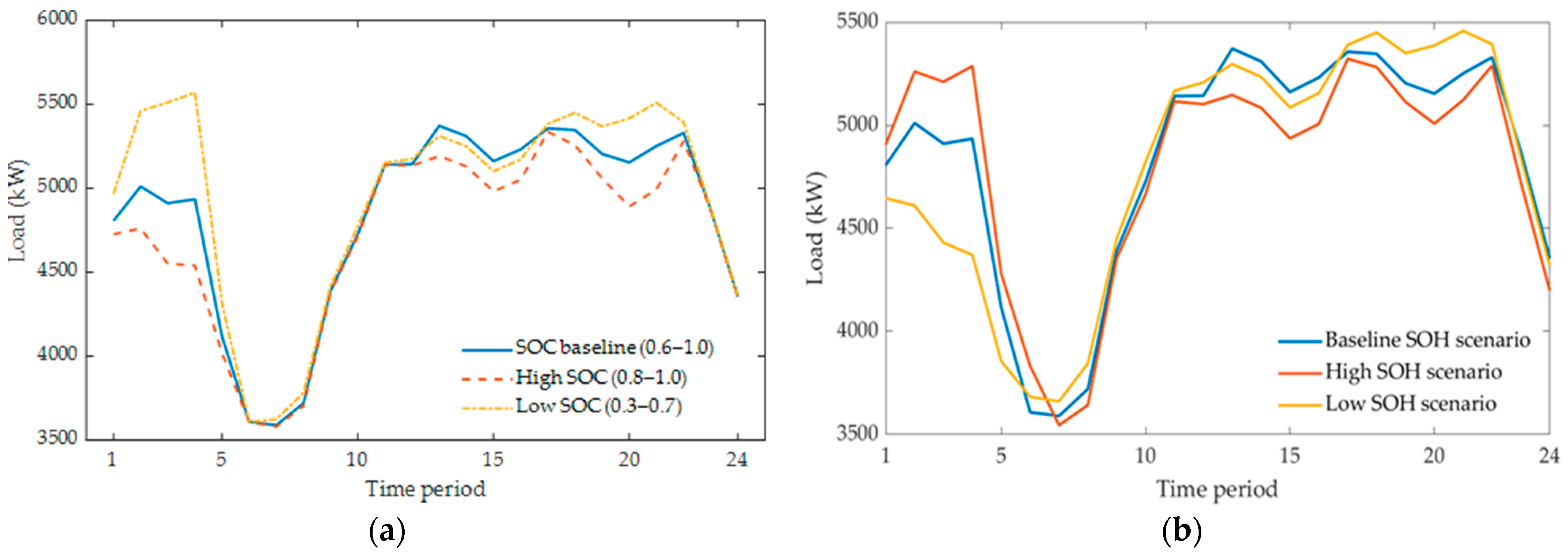 - The initial SOC distribution and the fleet SOH composition influence the available flexibility and the achievable peak-shaving performance. In the numerical example, the reduction in the peak–valley difference was about 23.7% in the high-SOC scenario and about 14.8% in the low-SOC scenario. Across different SOH scenarios, a higher proportion of high-SOH batteries leads to slightly lower peak loads and better peak shaving, whereas fleets dominated by lower-SOH batteries show weaker peak reduction but still maintain a clear load-smoothing effect.
