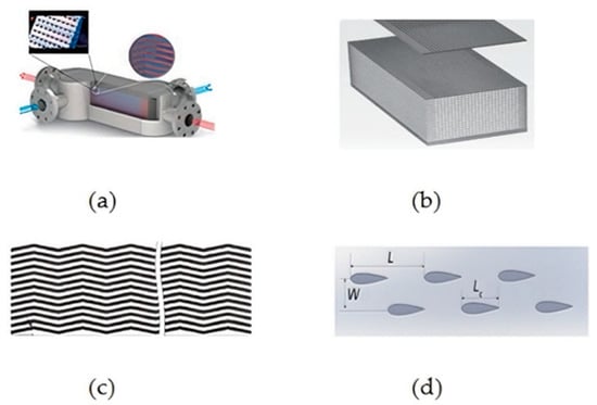 In simple recuperated cycles, 60.0~70.0% of total heat transfer occurs within recuperators [13], thus requiring essential studies on their thermal performance for overall efficiency enhancement. As compact heat exchange devices, printed circuit heat exchangers (PCHEs) deliver superior heat-transfer capabilities and high thermal effectiveness (>2500.0 m2/m3 surface density) due to their exceptionally large heat-transfer area [14]. The stringent volumetric and weight constraints inherent to airborne systems necessitate the adoption of such compact heat exchangers. To optimize system-level thermal performance and PCHE efficiency, researchers focus on flow channel geometry improvements. Current PCHE channel architectures are categorized into the following: continuous channels—straight, serpentine (Z-type), ladder-type, and sinusoidal (S-type) configurations; discontinuous channels—rectangular fins, elliptical fins, corrugated fins, and airfoil-shaped fins, which are shown in Figure 6.