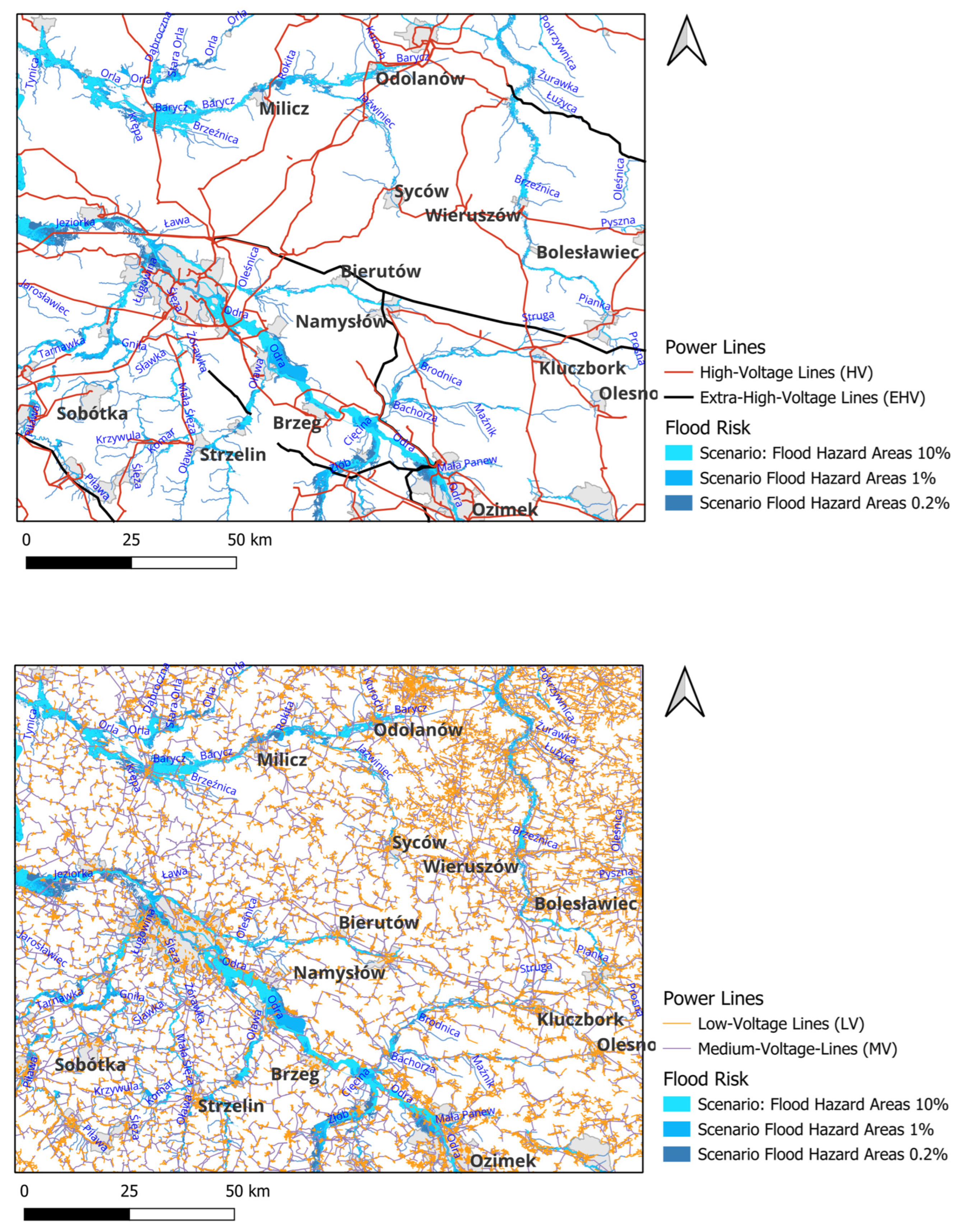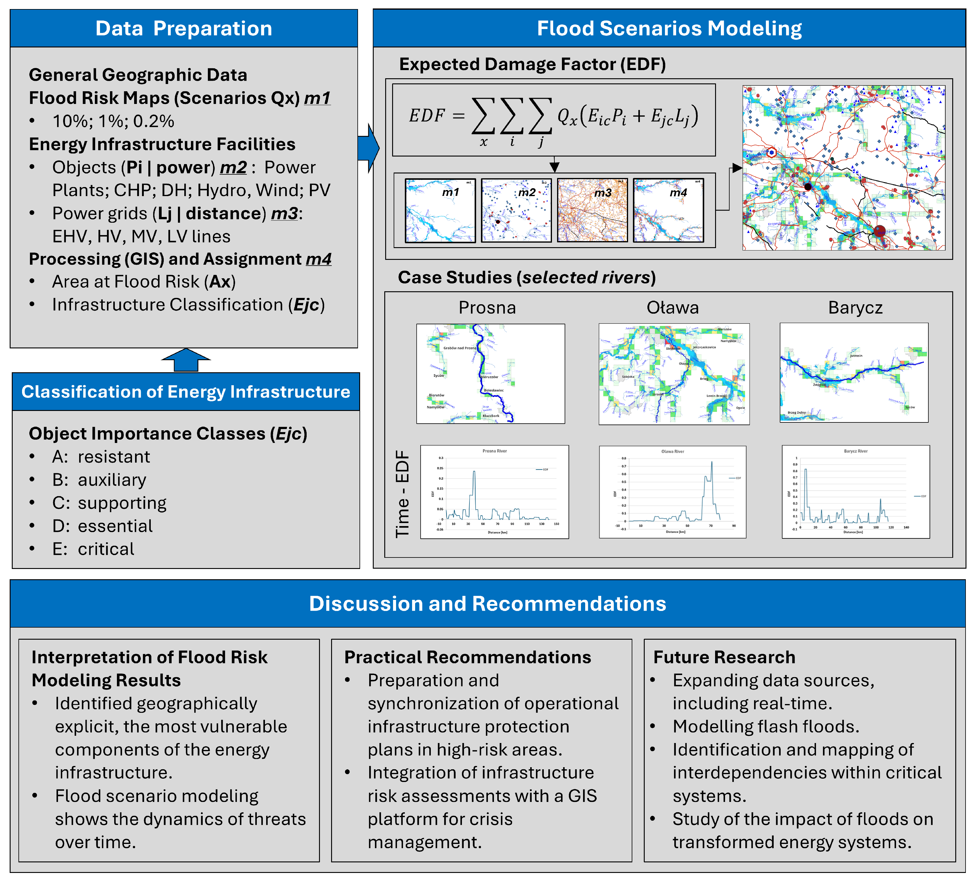 The model relies exclusively on data from publicly available open sources. Data integration is implemented in a GIS environment using general geographic maps and flood risk maps. The model employs a five-level classification of energy infrastructure importance, encompassing both point and linear objects, which are assigned a scale of importance ranging from replaceable to critical. Flood scenario modelling is based on flood hazard maps for various probabilities of occurrence (10%, 1%, 0.2%). Spatial analysis is conducted on 5 × 5 km grids, representing an arbitrarily chosen degree of spatial aggregation. In the model implementation, the grid can be dynamically adjusted by the user to maintain model scalability. The assessment of the degree of loss (EDF) is based on the facility’s power parameters, length, importance class, and the percentage of flooded area within the analysed cell.