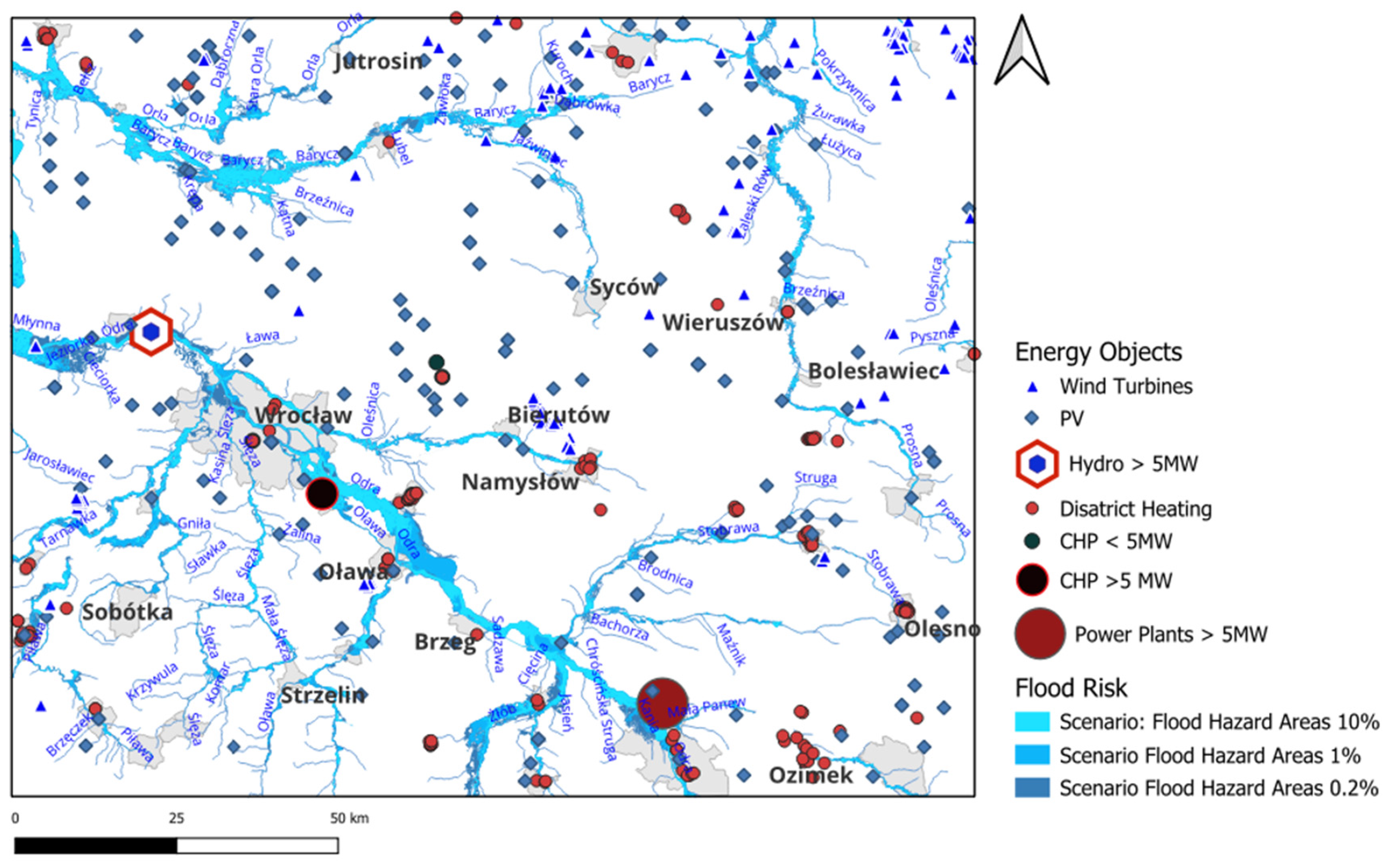 Geographic information systems (GISs) are playing an increasingly important role in risk management, serving not only to monitor and coordinate operational management activities during the response phase. GISs are also useful in other stages of crisis management, i.e., in planning and mitigating the effects of disasters and monitoring threats at the central level. In the preparation phase, they enable multi-criteria spatial analyses, which are helpful in risk assessment and planning at the local level. In the context of floods, publicly available risk maps are useful. In Poland, the National Water Management Authority [17] is responsible for preparing and updating flood risk maps. GIS spatial analyses are characterised by scalability and interoperability, while data availability and the development of intelligent processing methods multiply analytical and operational capabilities. GISs are used to support energy planning at the local level [47,48]. One example of combining multi-criteria decision analysis with GIS (GIS-based MCDA) is the work [49]. The authors applied multi-criteria GIS analysis for energy companies to assess locations for power plants, taking into account social and environmental factors as well as hazards. Examples of vulnerability assessments for flood hazards [50,51,52]. It is worth mentioning the works [53,54]. In the first authors analyse the vulnerability of integrated energy and transport systems to extreme weather events, highlighting the complexity of interdependencies and their impact on the resilience of critical infrastructure. The authors use risk modelling and vulnerability analysis methods, pointing to the need to integrate adaptive infrastructure management strategies in the face of climate change. The second researchers’ team [54] assess the vulnerability and interdependencies of critical infrastructures in the context of climate change adaptation and flood mitigation. The study indicates that taking into account the interdependencies between systems such as energy, transport and water management is crucial for resilience. In turn, the report [55], based on analyses of flash floods, discusses the preparedness of cities for floods and flooding caused by heavy rainfall in order to protect critical infrastructure.