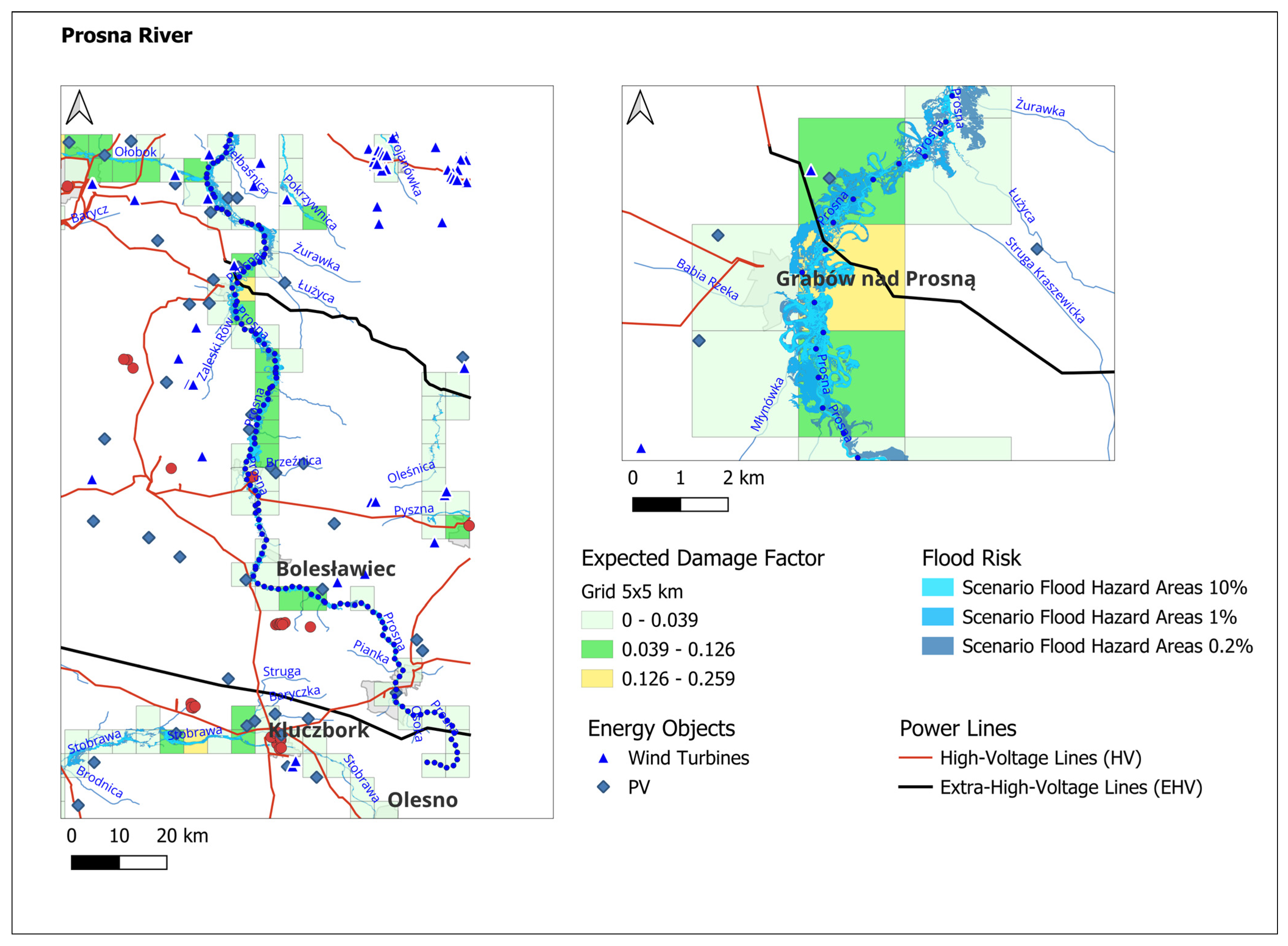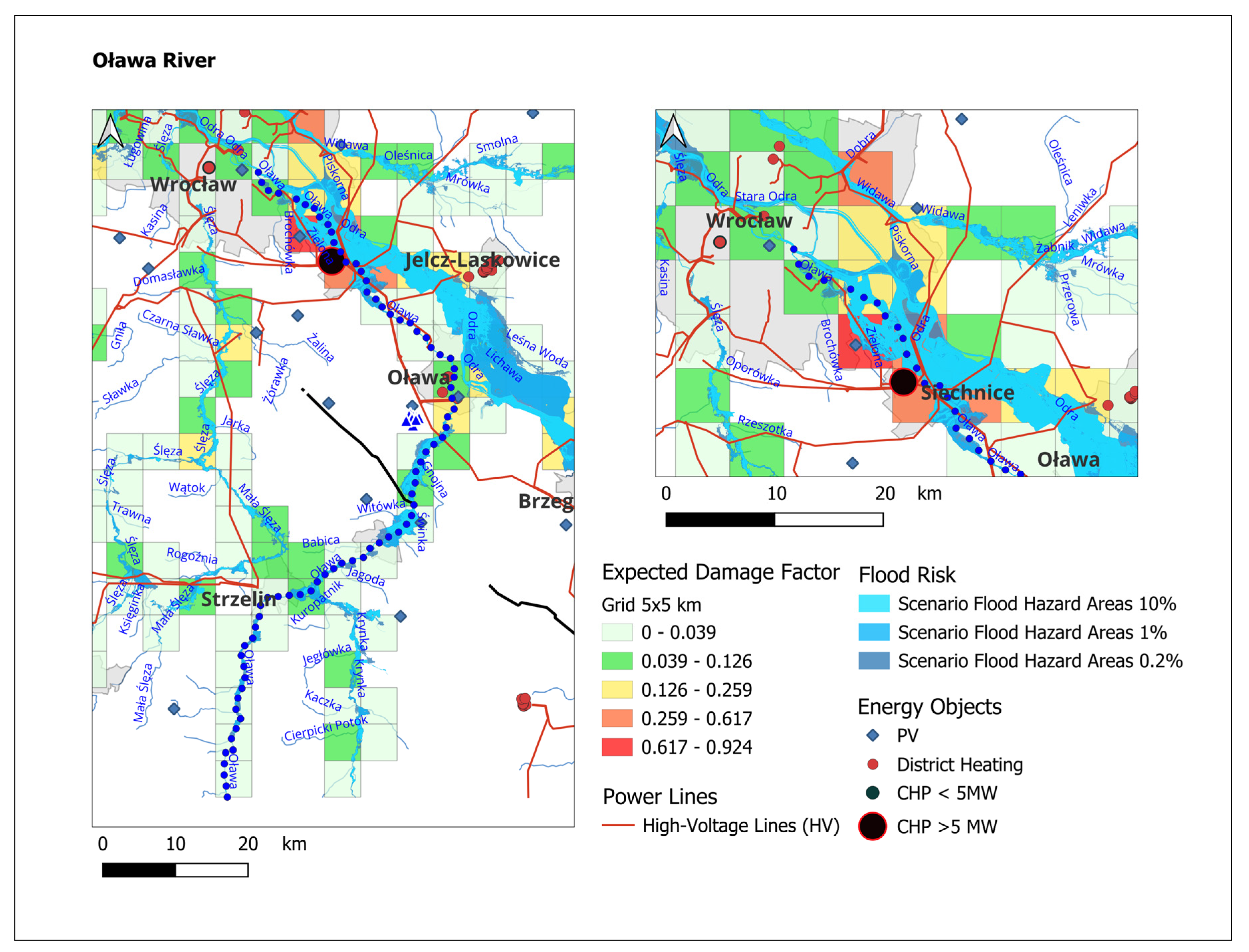 Modelling is performed in a GIS system. Point objects located in flood zones are identified, and the basic parameters are power and significance class. In the case of linear objects, i.e., power grids, the lengths of the grids in flooded areas, expressed in kilometers, are assessed. As previously mentioned, the analysis is conducted on 5 × 5 km grids, and the Expected Damage Factor (EDF) is calculated for each grid element.