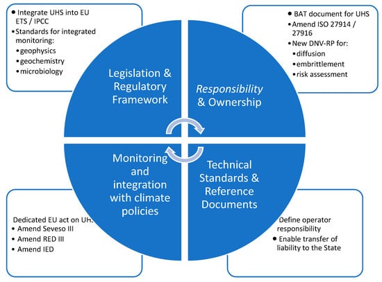On this basis, a hybrid UHS model has been proposed, combining the operational and exploitation elements of UGS with the regulatory rigour and liability systems used in CCS. Such a model can ensure both environmental and social safety and the operational efficiency of the technology. Figure 6 illustrates the transition from the current regulatory landscape to a dedicated and integrated UHS framework, highlighting the key elements required to enable its safe and large-scale deployment.