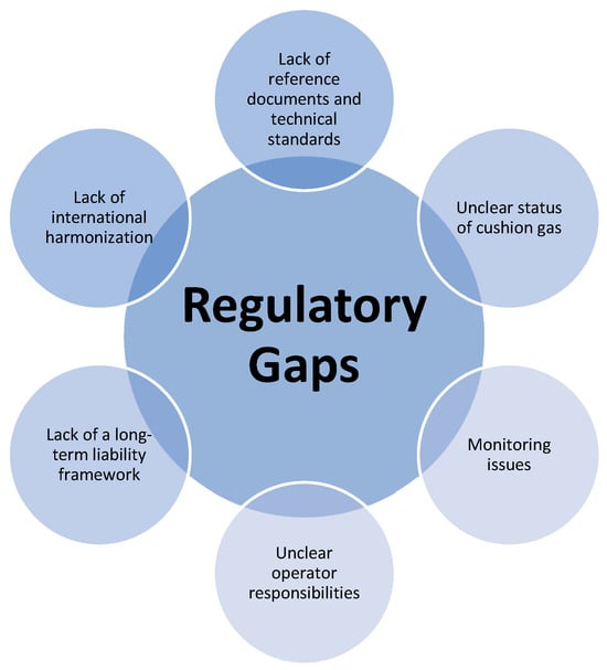 The lack of a clear legal classification of hydrogen creates significant challenges for its underground storage. This affects legal interpretation, operational practice, and regulatory consistency throughout the storage lifecycle. Key issues include the following (Figure 2):