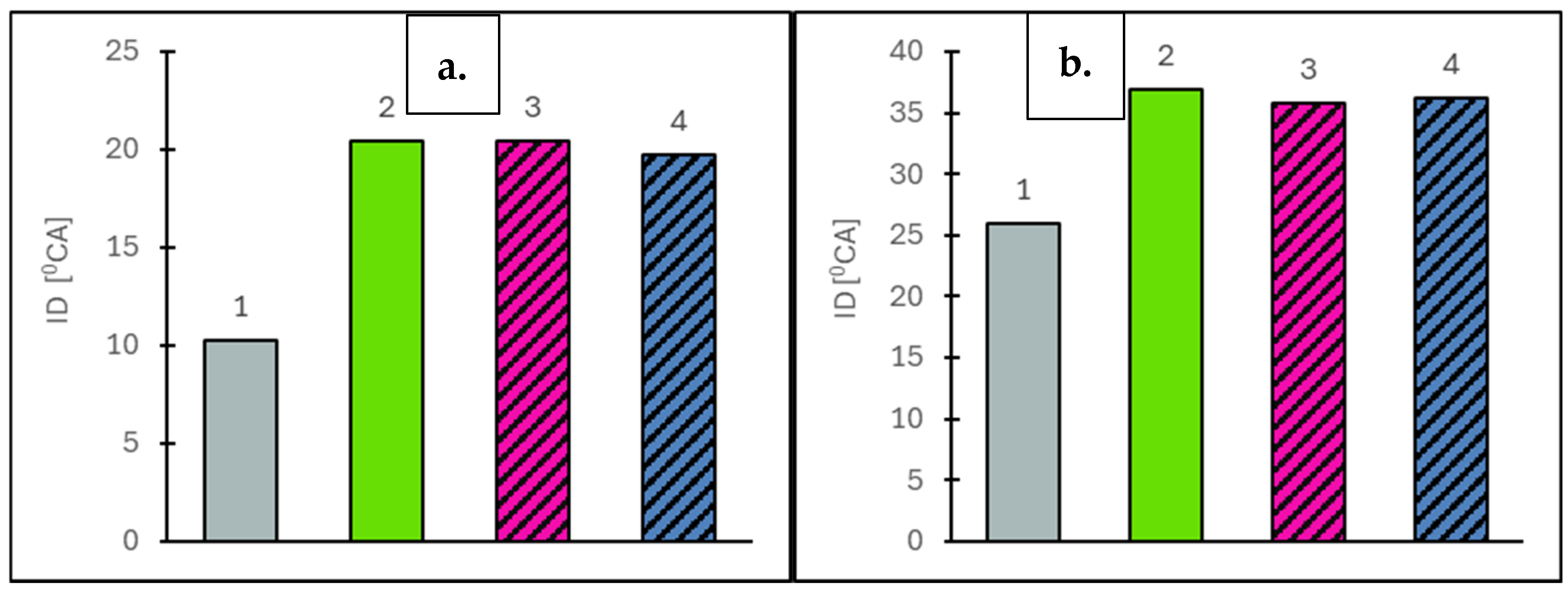 - Zdziennicka, A.; Szymczyk, K.; Jańczuk, B.; Longwic, R.; Sander, P. Surface, Volumetric, and Wetting Properties of Oleic, Linoleic, and Linolenic Acids with Regards to Application of Canola Oil in Diesel Engines. Appl. Sci. 2019, 9, 3445. [Google Scholar] [CrossRef]