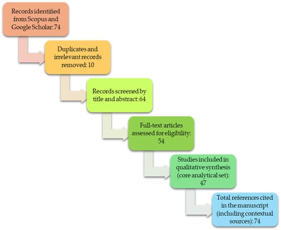 The records obtained were organised in a Microsoft Excel matrix to perform the initial screening, reviewing titles, abstracts, biomass type, study objective, study design, bioproducts produced, results and conclusions. Of the 74 documents initially identified, 10 were removed as duplicates or for irrelevance after title–abstract screening, resulting in 64 documents assessed for eligibility. Subsequently, specific sections or, in some cases, the full text of the selected articles were examined to confirm their relevance. In total, 47 documents were included in the core qualitative synthesis, although 74 sources were ultimately cited in the manuscript when including contextual and institutional documents. The initial search identified 74 records across all topics, of which 22 were related to seagrass biomass (9 included), 20 to Sargassum (10 included), 15 to cactus species (13 included), 13 to seawater energy potential (11 included), and 4 to coastal wind and solar radiation energy potential. Inclusion decisions were guided by two criteria: (i) documented relevance to coastal or arid biomass systems in the Caribbean or comparable environments, and (ii) availability of quantitative or qualitative information useful for assessing physicochemical properties, resource availability or bioenergy potential. The overall process of literature identification, screening, and inclusion is summarised in Figure 1.