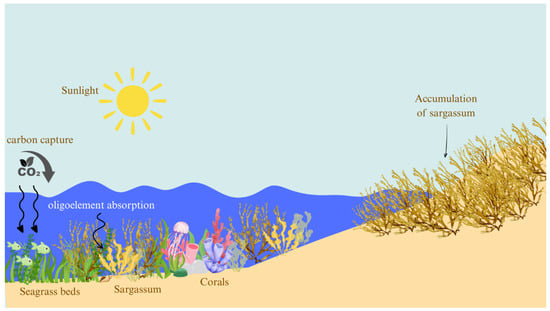 In this review, the term “Sargassum” refers specifically to the pelagic holopelagic species Sargassum natans and Sargassum fluitans, which form floating mats in the tropical Atlantic and Caribbean. Although Figure 3 illustrates the general ecological dynamics of benthic Sargassum, the bioproduct applications discussed in this study are based exclusively on pelagic biomass, which is the type that accumulates on Caribbean coasts and is harvested for valorisation.