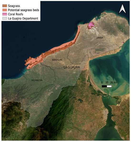 Of these departments, the area of interest for study is the department of La Guajira. To understand its geographical location, the map in Figure 5 was developed, which explicitly indicates the location of seagrass beds (represented in brown on the map) and potential areas where seagrass beds are likely to exist but have not yet been characterised. In addition, some seagrasses are found in coral areas, which should be conserved and protected due to their importance in marine and ecosystem biodiversity conservation. The seagrasses are located on the coasts of the municipalities of Riohacha, Manaure, and Uribia.