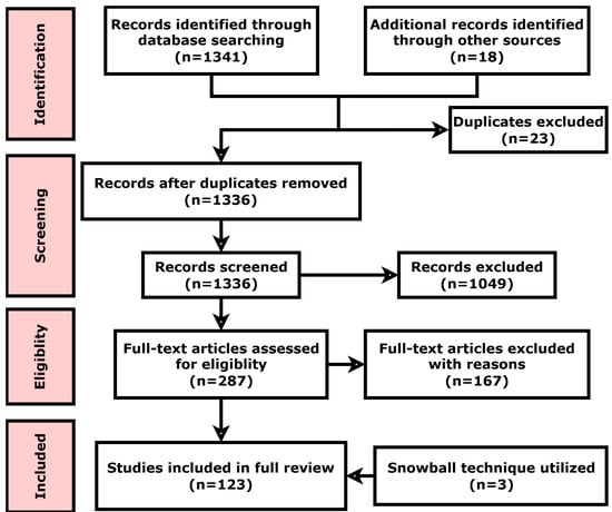 A total of 1341 research papers were identified in two databases, (i) Scopus and (ii) WOS, comprising primarily peer-reviewed journal articles and conference proceedings. Also, 18 external sources (including reports) were included because these were relevant to the scope of this study. After eliminating 23 duplicates, 1336 articles were reviewed based on their titles and abstracts. Three conditions were applied during the selection process: Yes = 1 (assigned when the paper meets the inclusion criteria), Maybe = 2 (assigned when unsure regarding the decision-making, and later, a full-text assessment is conducted), and No = 0 (assigned if the paper meets the exclusion criteria). Research papers marked as ‘Yes’ were included in the review; those marked as ‘No’ were excluded, while documents marked as ‘Maybe’ were subject to further evaluation after analysis of the full text.