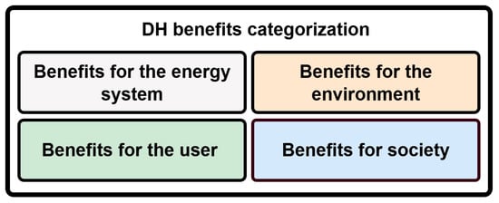 After analysing the literature, we identified and grouped DH benefits into four categories i.e., (a) benefits for the energy system, (b) benefits for the environment, (c) benefits for the user, and (d) benefits for society. In the next sections, we present the results for each category of benefits.
