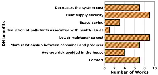 We identified various DH benefits for the end user in 38 research works, including “comfort”, “average risk avoided in the house”, “more relationship between consumer and producer”, “lower maintenance cost”, “reduction of pollutants associated with health issues”, “space saving”, “heat supply security”, and “decreased system cost”. Figure 7 shows various DH benefits for the end user identified from different research works.