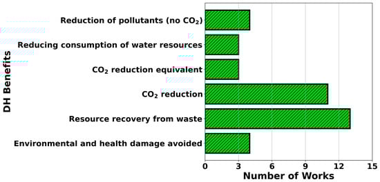We identified various benefits for the environment associated with the use of DH systems in 35 studies included in the review. Benefits to the environment include “environmental and health damage avoided”, “resource recovery from waste”, “CO2 reduction”, “CO2 reduction equivalent”, “reduced consumption of water resources”, and “reduction of pollutants (no CO2)”. Figure 8 displays several DH benefits for the environment acquired from several research works.