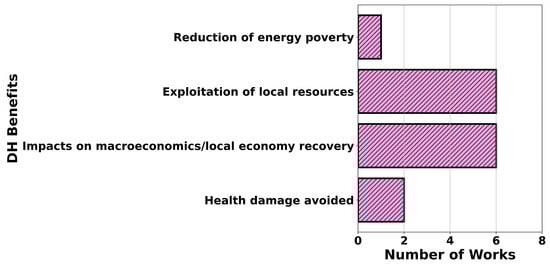 Overall, we found 15 research works where researchers considered benefits to society, including “health damage avoided”, “impacts on macroeconomics/local economy recovery”, “exploitation of local resources”, and “reduction of energy poverty”. Figure 9 shows the DH benefits for society obtained from several scientific works.