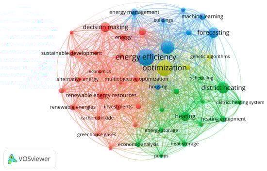 Different keyword connections of DH research works (data obtained from Scopus and analysed with VOSviewer). The size of the nodes indicates the number of connections between keywords, and the thickness of the links represents the strength of those connections. Energy efficiency (blue colour), optimisation (yellowish green colour), and district heating (green colour) appeared most frequently, while economics, investments, heat storage, and carbon dioxide, among other keywords, were less prevalent (in the credit of VOSviwer.com [27]).