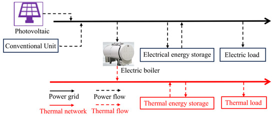 The source side encompasses PV output, conventional power units. The electric boiler functions as a thermoelectric conversion device, thereby facilitating complementary multi-energy flows. Concurrently, thermal and electrical storage devices facilitate the absorption of surplus photovoltaic output, thereby mitigating the fluctuations in photovoltaic power generation.