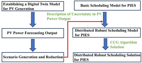 The overall logic of the distributed robust scheduling model for PIES is demonstrated in Figure 4. Firstly, a digital twin model for photovoltaic generation is established, along with a basic PIES scheduling model that aims to minimize system operational costs without considering the uncertainty in photovoltaic output. As a consequence of photovoltaic power forecasting, errors are introduced, and multiple scenarios are generated to match the error distribution. These scenarios are then reduced to a small number of representative ones, each assigned a corresponding probability. The inherent variability in photovoltaic output is then integrated into the fundamental PIES scheduling model, thereby transforming it into a distributed, robust scheduling model for PIES. Ultimately, the CCG algorithm is employed to solve and obtain the final distributed robust scheduling solution for PIES.