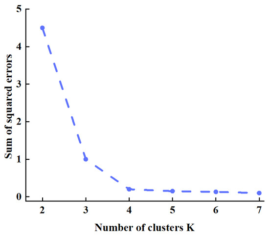 Based on the PV output forecast results, LHS was employed to generate 1000 PV output scenarios conforming to the PV forecast output error distribution. With K values set to equal intervals from 2 to 7, elbow diagrams based on the sum of squared errors and contour coefficient diagrams were plotted, as shown in Figure 7 and Figure 8.