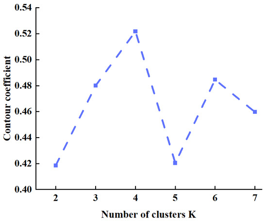 The contour coefficient serves to describe the clarity of each cluster’s outline following clustering, constituting a vital metric for evaluating clustering efficacy. Its core function lies in simultaneously measuring intra-cluster compactness and inter-cluster separation, thereby determining the validity of the clustering. The contour coefficient comprises two components: the intraclass average distance and the interclass minimum distance . The specific expression is as follows:
