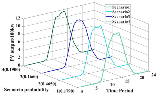 In order to account for subsequent scheduling robustness requirements, it is necessary to superimpose error margins on the PV forecast. However, PV forecast results incorporating uncertainty errors are calculated during the scheduling process. Consequently, multi-scenario techniques can be utilized to transform PV forecasts with uncertainty errors into a set of deterministic scenarios [25,26]. The prediction error of PV output can be modeled as a population following a normal distribution with zero mean. Consequently, the actual PV power can be expressed as in Equation (5).