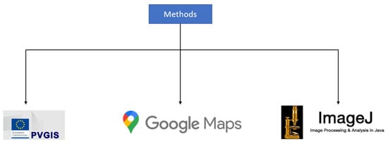 A hypothetical installation of photovoltaic systems has been considered at the four airports previously indicated, each situated at distinct latitudes, longitudes, solar radiation levels, and meteorological circumstances across three different continents. Figure 1 summarizes the software tools used to design PV installations. Google Maps [25] was used to pinpoint exact locations for the installation of photovoltaic systems and determine the size of buildings in the region of interest using the scale bar in the image. PVGIS 5.3 software [26] (developed by the European Commission, Joint Research Centre, Energy Efficiency and Renewables Unit, Ispra (VA), Italy) was used to determine the slope for panel installation and power outcomes. ImageJ software 1.52a (developed by the National Institutes of Health, Bethesda, MD, USA) was utilized to calculate the total area for the installation of PV systems [27].