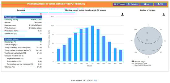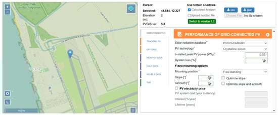 The PVGIS release 5.3 European Union database software was used to evaluate the solar energy potential of airports. This software includes data of solar radiation from satellite data. In the data, average clouds are considered. For instance, Sarah’s database picks up data from EUMETSAT (Climate Monitoring Satellite Application Facility) [28,29]. In particular, the database of solar radiation PVGIS-SARAH3 was used in this study. This dataset is incorporated in PVGIS release 5.3 and considers solar radiation from 2005 to 2023. Data are given as averaged quantities without uncertainty information [30]. To estimate the energy produced by each module in a given installation site, the key parameters were introduced into PVGIS, including an azimuth depending on the considered building orientation, a slope of 15°, and an installed peak photovoltaic output of 0.55 kWp (Figure 2). The slope was determined as the trade-off between the installed power and produced energy, considering a maximization of the installed power that can be achieved by fixing the slope to 0°. Such a condition is clearly not acceptable, and a slope larger than 0° has to be maintained to allow for natural rain cleaning of the PV panels. Then, these figures were selected to achieve maximum installed power while taking shadow behaviors into account.