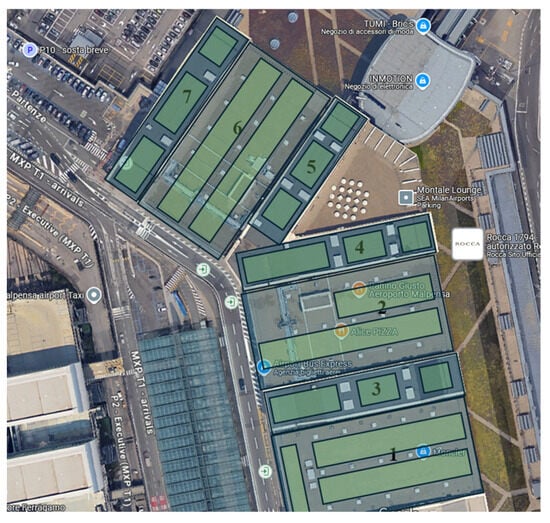 Suitable roof areas for solar panel installation were identified via Google Maps’ satellite imagery, considering the airport’s structures in February 2025. Screenshots of the airport roofs were obtained at a consistent north direction and zoom level. Each image (e.g., Figure 4) has its scale bar and north orientation. This information allows us to evaluate roof areas and building azimuth with respect to the south direction. Certain buildings were identified as potential candidates to install PV modules on their roof surfaces, while those with an insufficient roof area (typically allowing for less than 10 panels) were dismissed. Figure 5 shows the images of all airports with a north direction.