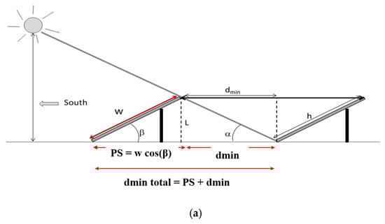 where β is the module slope on Figure 7a, fixed to 15° as found in the optimization process, w is the panel length (w = 2.279 m), δ is the sun declination equal to −23.45° on 21 December in the Northern Hemisphere, φ is the latitude of the installation site, and PS is the length of the module projection on the x axis, as in Figure 7a.