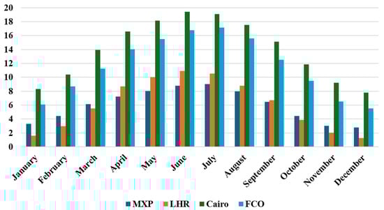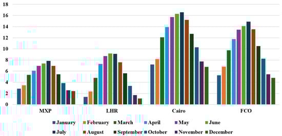 Figure 11 shows how much battery recharging capacity solar systems have each month at Milan Malpensa (MXP), Rome Fiumicino (FCO), London Heathrow (LHR), and Cairo International Airports. The graph shows the daily average of Airbus A320 batteries (28 MWh apiece) that may be charged, emphasizing notable seasonal variations across the airports. MXP’s capacity varies from 2 to 8 batteries daily, reaching its zenith in July owing to increased solar production. FCO has the greatest variety, ranging from 5 to 16 batteries per day, with a peak in July. LHR’s capacity varies from 1 to 10 batteries, peaking in June, indicative of seasonal solar trends. Cairo maintains consistent solar power production, recharging 7 to 19 batteries daily, with June as the peak month, underscoring its reliable solar potential throughout the year. These variations in Table 4 highlights the influence of sun availability and regional disparities on daily recharging capacity. Nevertheless, when managing electric aircraft using only green energy, only a small percentage of the total number of daily flights can be recharged. For instance, FCO airport manages more than 10 flight departures per hour, so 5–16 charged batteries per day with an additional 88.4 MW of photovoltaic power installed (22 MW is the current installed power) is just a small part of all the required energy to manage electrical aircraft supply with green energy, considering that in FCO, a 22 MW PV plant has been in operation since 2024.
