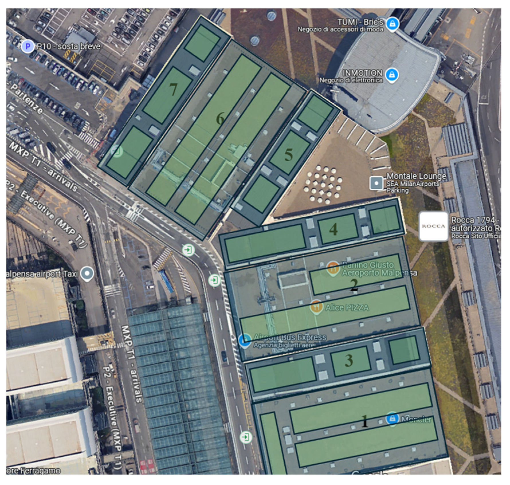 - Aeroporto Guglielmo Marconi di Bologna S.p.A. Projects Involving Photovoltaic Systems. Bologna Airport Official Website. 2025. Available online: https://www.bologna-airport.it/en/innovability/sustainability/sustainability-plan/photovoltaic/?idC=62809 (accessed on 24 November 2025).