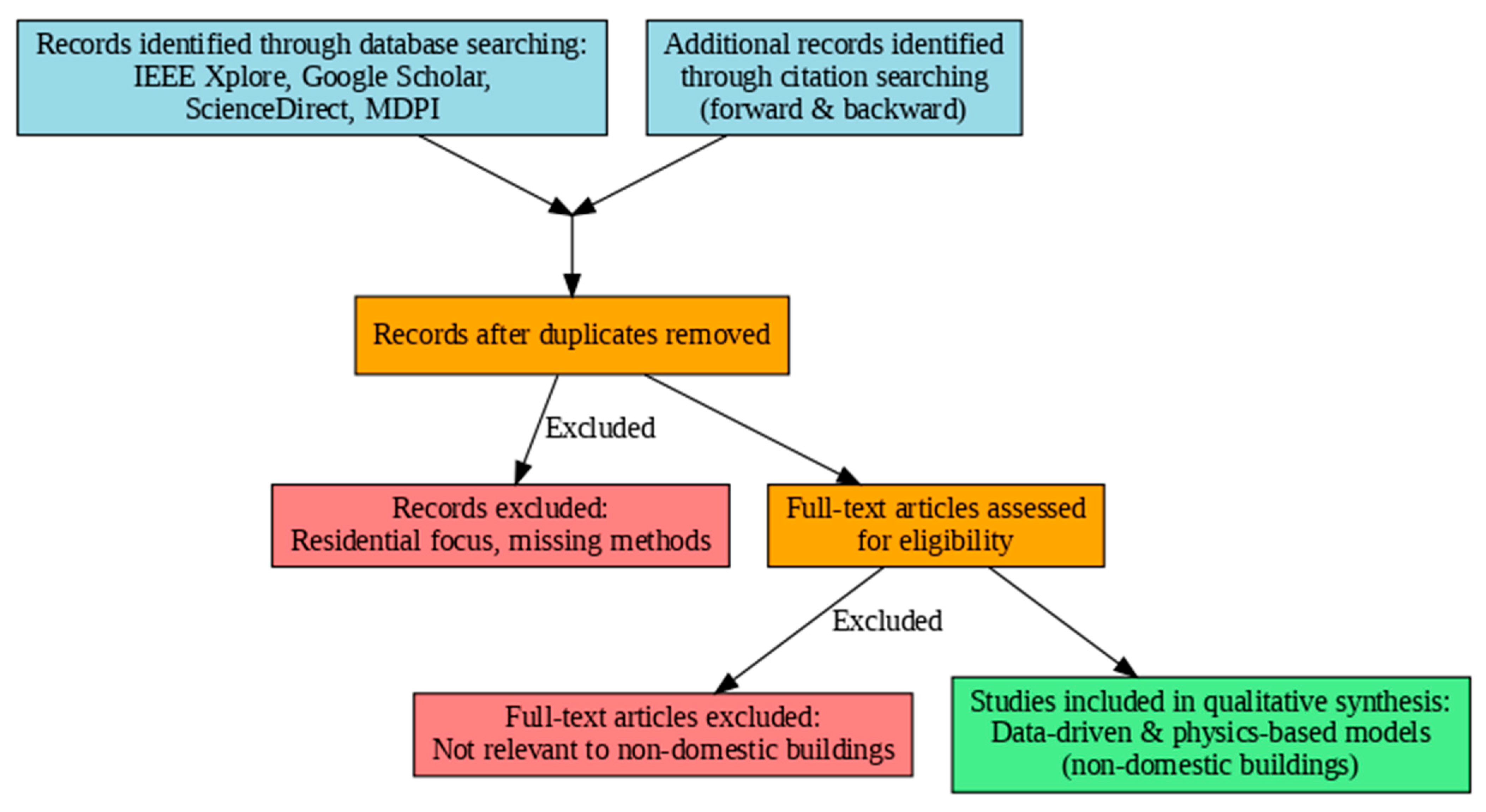 - Prioritizing Energy Performance of Non-Domestic Buildings: Unlike most studies, which discuss energy modeling of houses or buildings in general, indirectly and projectively, the review at hand aims specifically at non-domestic buildings such as commercial, industrial, and institutional buildings. In so doing, it addresses a critical knowledge gap regarding the specific parameters impacting energy consumption in these gigantic, complex buildings.