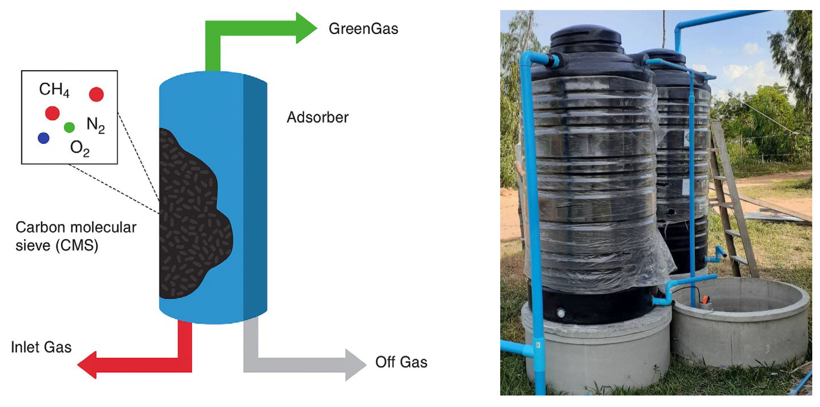 A Pressure Swing Adsorption unit equipped with Carbon Molecular Sieve (CMS) media was employed to separate CO2 and H2S from methane. Gas composition was measured using GC-TCD before and after purification. The upgraded gas achieved 65–70% CH4, with CO2 reduced to approximately 28–30% and H2S below 100 ppm.
