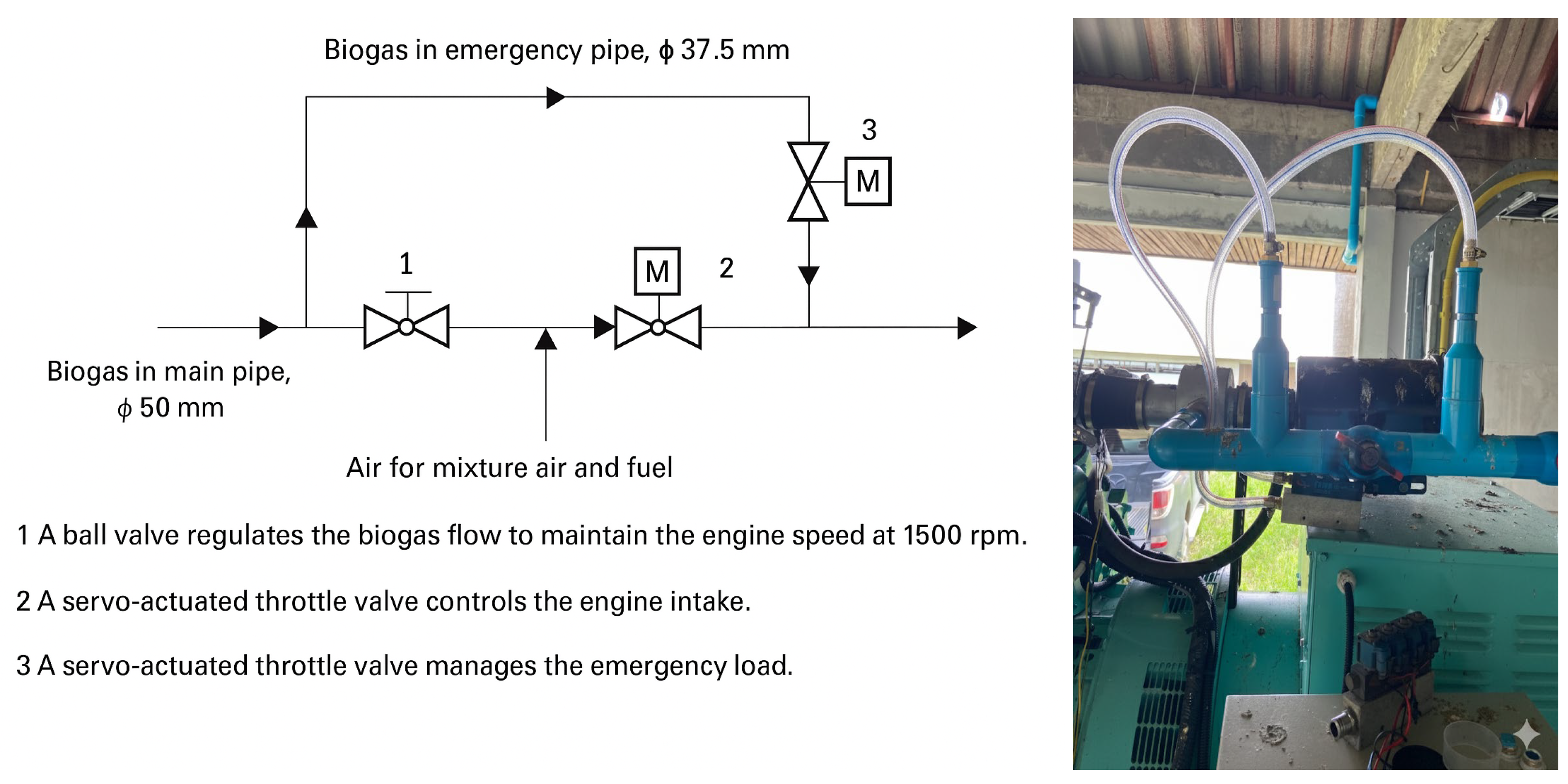 Ball valve—regulates the biogas flow to maintain a constant engine speed of 1500 rpm.