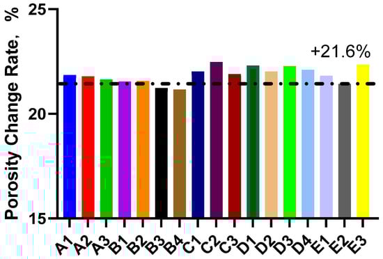 Porosity changes showed a consistent increasing trend across all core types, as illustrated in Figure 2. All cores exhibited porosity increase, ranging from 21.2% to 22.5%, with an average of 21.6% (marked by the horizontal dashed line). C2 showed the maximum porosity increase (22.5%), B3 showed the minimum increase (21.2%). No significant correlation between porosity change magnitude and initial permeability, suggesting matrix dissolution is the dominant mechanism.