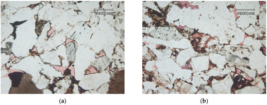 The impact of long-term water flooding on pore throat structure is directly observable through comparative microscopy of high- and low-permeability cores after 500 PV injection. For high-permeability cores (Figure 3), pre-flooding images show brown clay aggregates filling intergranular pores, while post-flooding images reveal cleaned pore spaces with residual clay films (red-stained areas), indicating clay particle mobilization and transport out of the core. In contrast, low-permeability cores (Figure 4) exhibit dispersed clay particles (kaolinite) in isolated pores before flooding, which transform into aggregated clay plugs (dark brown regions) blocking throats < 10 μm after flooding.