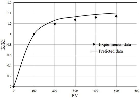 For the high-permeability core A1, the model parameters were set as follows: , , . The model prediction for the permeability ratio at 500 PV was: