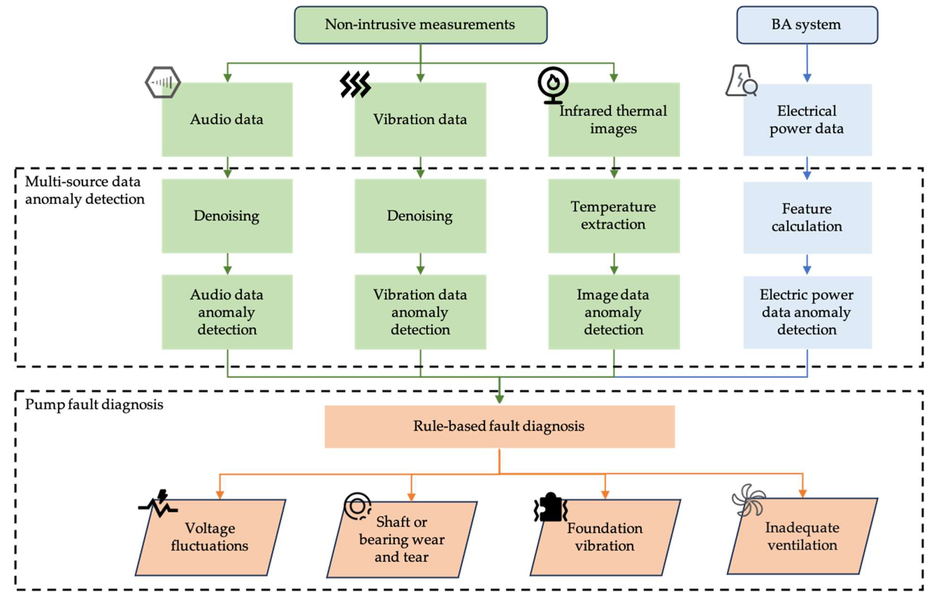 - A two-step multi-source data-based method is proposed for pump fault diagnosis. The first step performs anomaly detection on each data type individually, followed by a rule-based fusion for comprehensive fault diagnosis. By analyzing anomaly indicators from different data sources, the proposed method reduces the risk of missed fault detection and demonstrates enhanced robustness. Unlike conventional FDD methods that require a lot of sensors or complex models to identify different fault types, which usually needs to retrain the model for a new case, our method can be directly deployed in new pump systems.