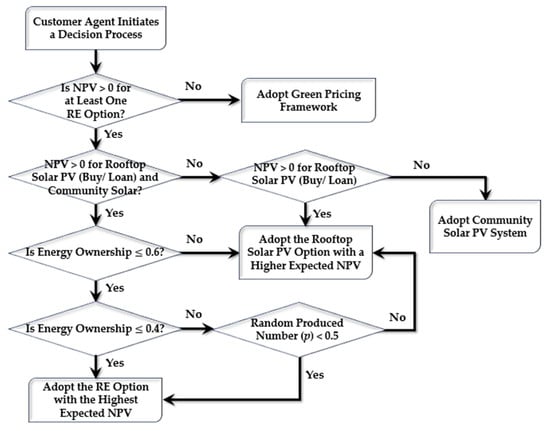 where H is a random number. Agents will calculate the NPC of the solar PV system to predict if they are capable of purchasing a solar PV system. They also refer to a logical decision-making process to determine if they can install a solar PV system, as illustrated in Table 6.