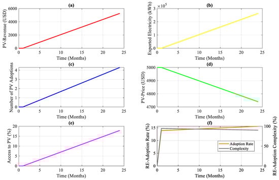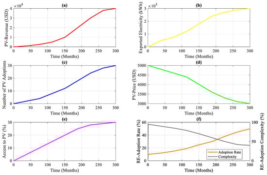 The main goal of AGM is to foresee prosumer implementation behavior and their psychological and socio-economic response to various RE models, RE policies, and governmental energy subsidies and frameworks. Therefore, this approach can help decision-makers in optimally designing better energy strategies that enable RE to prosper and grow without triggering equity problems among certain stakeholders. Also, AGM aims to identify the effects of implementing RE-growth-acceleration approaches. Thus, a better understanding and key insights into key RE drivers can be recognized, aiding energy actors in using the most suitable energy development tactics to enhance overall RE performance, considering various stakeholders’ metrics. These metrics include NPC, revenue from solar PV systems, the overall clean electric power exported to the grid, and the overall prosumer involvement in RE models at each simulated time step. Critical examples of stakeholders’ metrics are displayed in Table 2.