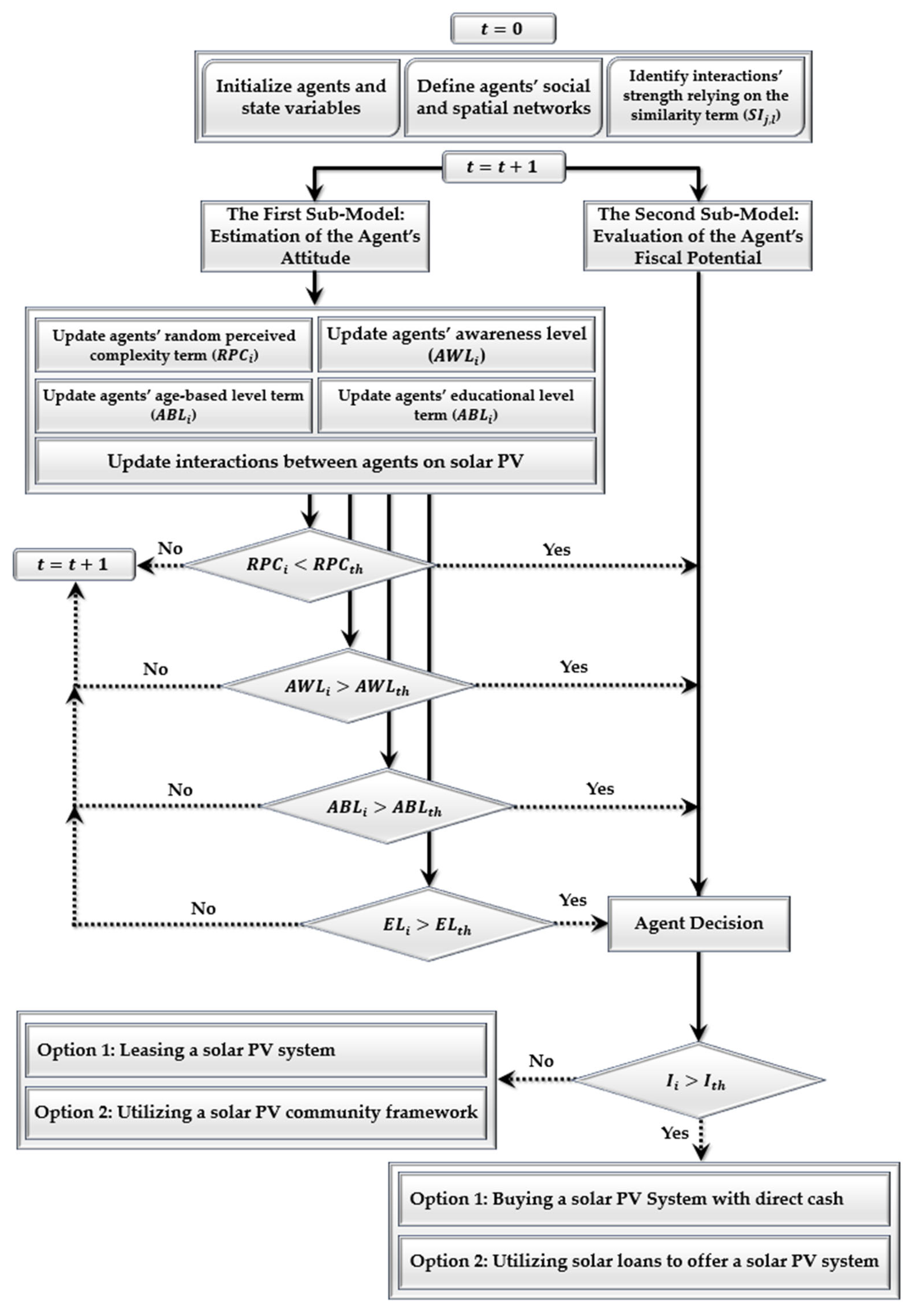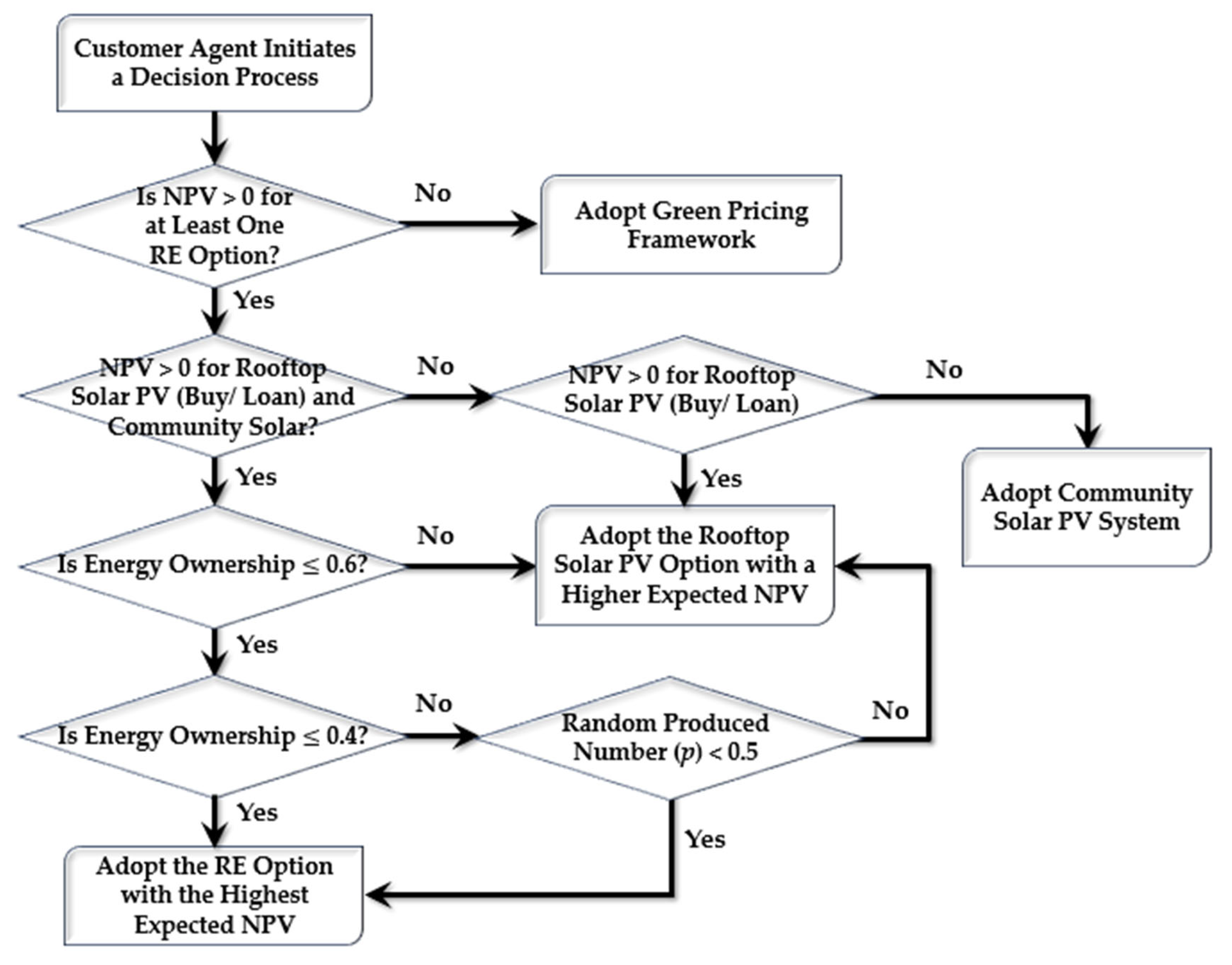 Figure 4, it can be observed that if there is sufficient financial liquidity among agents, they would consider directly buying a solar PV system for their home because their financial capabilities are suitable to cover the NPC of the solar PV system. Comparatively, if they have less financing potential, they would consider adopting other solutions, such as a green pricing framework. If they have less fiscal liquidity, they would think of taking a bank loan. At the same time, if their financial liquidity is very low, they would consider adopting community solar PV systems, with the risks and responsibilities covered by the government. It should be noted that random numbers are utilized. These numbers are crucial to consider fairness and unpredictability, which are taken into account when conducting numerical simulations by the ABM processes.