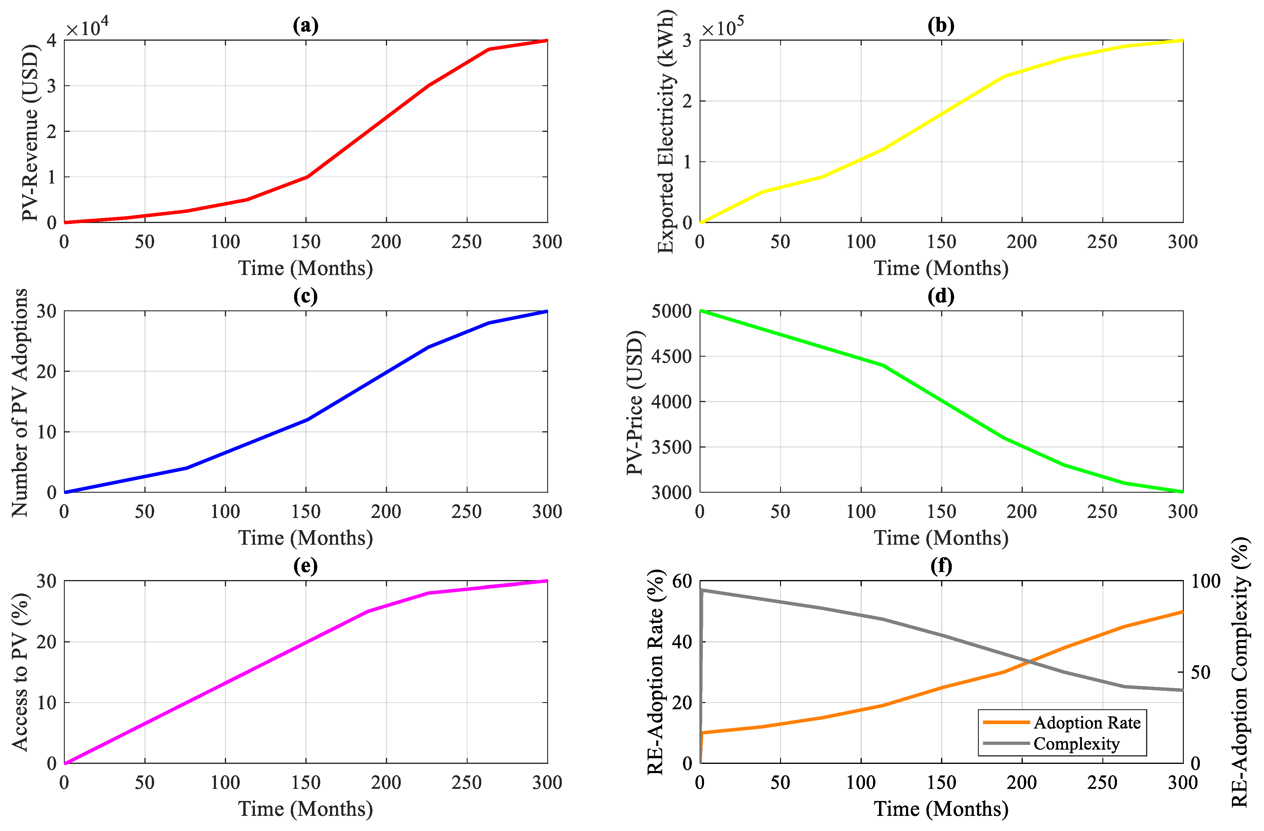Figure 6f indicates that the awareness would rise until it reaches approximately 0.8 out of 1.0. In contrast, due to increased awareness, interest, and perceptions of solar PV systems, the complexity, misconceptions, and vague data will be eliminated after 25 years.