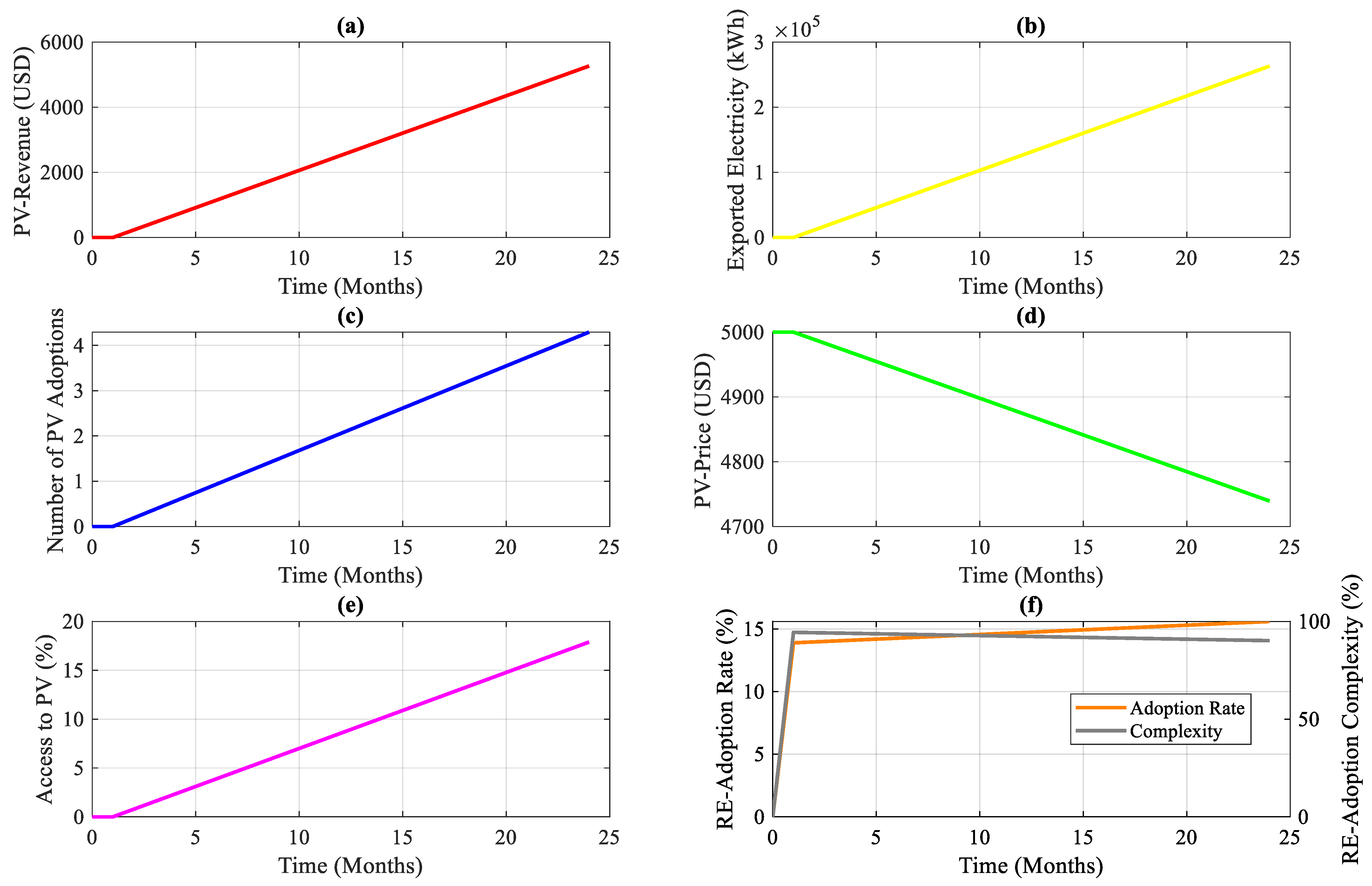 To ensure the validity and robustness of the results, a benchmark scenario was developed to serve as a means of comparative analysis. This scenario models the system’s behavior under the current policies, subsidies, and regulations, utilizing input parameters characterized by lower initial awareness, higher sustained PV system prices, and a higher perceived complexity scale (peaking at about 60% within two years). This scenario directly compares the time-series outcomes for all six key metrics (revenue, export, adopters, price, access, and awareness/complexity) over 24 months of solar PV installations.